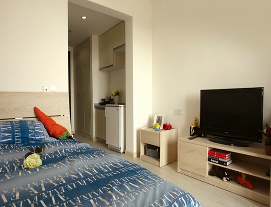 宿舍配置:1.2米床及床垫,简约床头柜,整体式衣柜,写字桌椅,电视机,冰箱,空调,电磁炉,太阳能热水供应,淋浴房。
